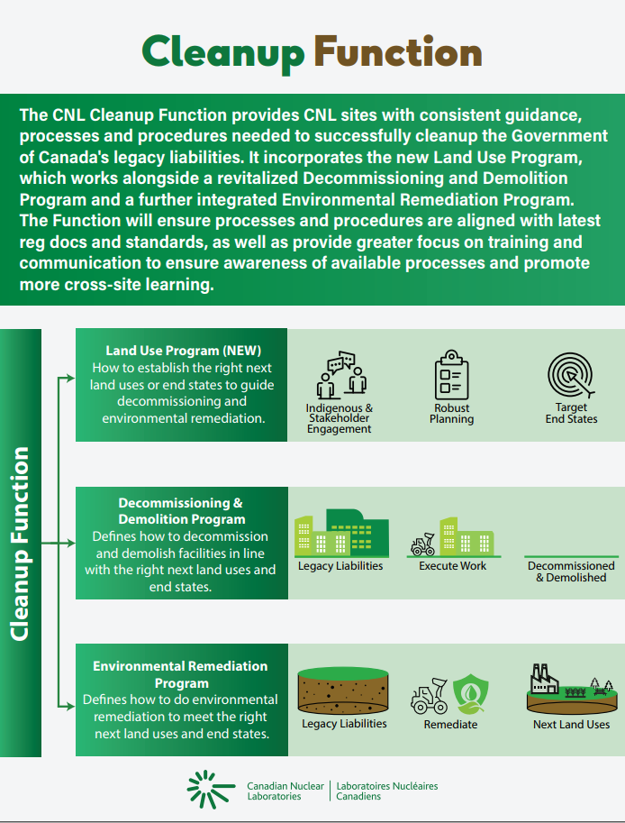 These revitalization efforts support the effective management and reduction of Canada’s nuclear liabilities through environmental remediation towards a sustainable and healthy environment.